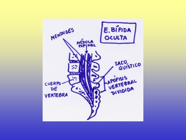 SINTOMATOLOGÍA Y TRASTORNOS ASOCIADOS (ESPINA BÍFIDA): ·HIDROCEFALIA (90% de los casos), acumulación de líquido cefalorraquídeo en las cavidades del encéfalo. ·PARÁLISIS o PARESIA por debajo del nivel de la lesión (de ligero entumecimiento a parálisis completa) ·MALFORMACIONES EN MIEMBROS INFERIORES. Pie equinovaro y alteraciones ortopédicas (luxación de caderas, cifosis. . . etc) · PÉRDIDA TOTAL O PARCIAL SE SENSIBILIDAD CUTÁNEA. ·PROBLEMAS DE ESFÍNTERES. ·ALTERACIONES INTESTINALES. ·INFECCIONES RENALES: Causa ésta de alto porcentaje de absentismo escolar.