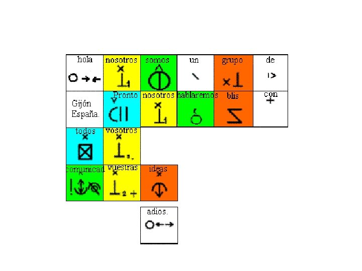 QUE AFECTAN A LOS ELEMENTOS DE ACCESO -De acceso a la COMUNICACIÓN (Derribo de barreras a la Comunicación): ØSAC: Se pretende la comunicación total. §BLISS consistente en: o. Pictografías, basadas en símbolos (trasparentes, traslúcidos y opacos) o. Código color: establece la categoría de palabra: personas/amarillo, sustantivos/naranja, verbos/verde, adjetivos/azul, sociales/rosa y miscelania/blanco.