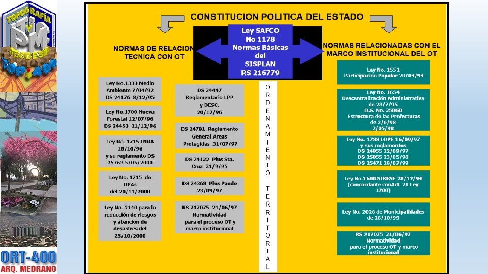 NORMAS RELACIONADAS CON EL MARCO INSTITUCIONAL DE LA OT Las Leyes que se refieren al ámbito institucional del OT son: • Ley No. 1551 de Participación Popular 20/04/94, • Ley No. 1654 de Descentralización Administrativa del 28/7/95, • Ley No. 1788 LOPE 16/09/97, etc. ). También