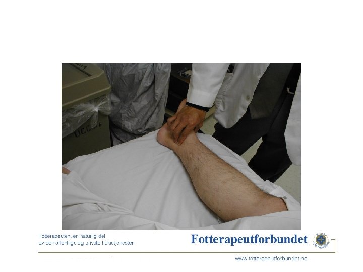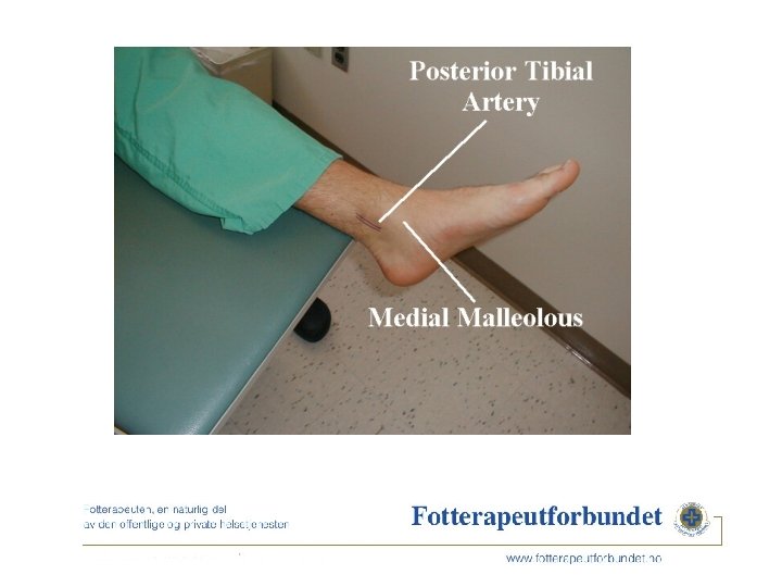 Puls Ø Palpering med fingertuppene Ø NB! 15 % av befolkningen har ikke følbar a. dorsalis pedis, men følbar puls i a. tibialis posterior. = sirkulasjon i foten. Ø Palpert puls = ingen alvorlig sirkulasjonssvikt (stort sett) Ø Ingen palpert puls + andre indikasjoner på risikopasient = send til fotterapeut med fordypning i diabetes, evt. fastlegen