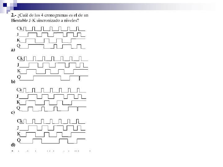 Cada tipo (RS, JK, D, T), las señales de entrada pueden ser síncronos por nivel, por pulso o por flanco, o Asíncronos