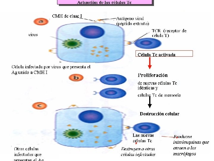 Función de los linfocitos Tc La célula infectada presenta oligopéptidos en su membrana unidos a MHC I. Un linfocito Tc los detecta y se une en colaboración con CD 8. El linfocito Tc se activa y produce un clon de Tc idénticos activos y otro de memoria. El linfocito Tc induce apoptosis en la célula mediante perforinas y libera interleucinas para atraer macrófagos.
