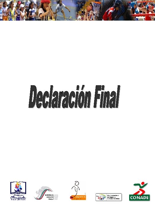 Los titulares y representantes de los Institutos Estatales del Deporte o su equivalente y los presidentes y representantes de las Asociaciones Deportivas nacionales, se reunieron en la Ciudad de México los días 5 y 6 de julio, a fin de celebrar el Congreso de la Olimpiada Nacional y emitieron la siguiente declaración: Presidida la reunión por el Licenciado Víctor M. Ramos del Bosque, Subdirector General de Cultura Física de la Comisión Nacional del Cultura Física y Deporte, nosotros los representantes de las entidades y organismos deportivos, interesados en contar con disposiciones que permitan una mejor planeación, organización, coordinación y operación del evento multideportivo de carácter nacional convocado por el Sistema Nacional del Cultura Física y Deporte (SINADE) , al cual se le ha venido denominando “OLIMPIADA NACIONAL” a la fecha con su modalidad “ELITE”, y a fin de que el evento de referencia se desarrolle en un ambiente de respeto, cordialidad y sea el medio para difundir los principios, valores y filosofía del movientoe Olímpico, durante el desarrollo de la Olimpiada y promover y apoyar los principios del juego limpio y estando conscientes de la necesida de revisar y actualizar los esquemas de cómo se viene realizando dicho evento y en la búsqueda por darle continuidad a los esfuerzos emprendidos por todos los integrantes del SINADE, hemos coincidido en los siguientes aspectos: 1. 2. 3. 4. Presentar propuestas de elementos que debe contener la Convocatoria así como el Reglamento General de Participación de la Olimpiada, debidamente fundados y motivados. Seleccionar las propuestas que más consenso tengan. Hacer llegar al Consejo directivo del Sistema Nacional de Cultura Física y Deporte, las propuestas finales emanadas en las mesas conformadas para su análisis. Se otorga voto de confianza al Consejo Directivo del SINADE, para que este determine la viabilidad de las propuestas. A los 6 días del mes de julio de 2005. Las entidades y organismos deportivos participantes