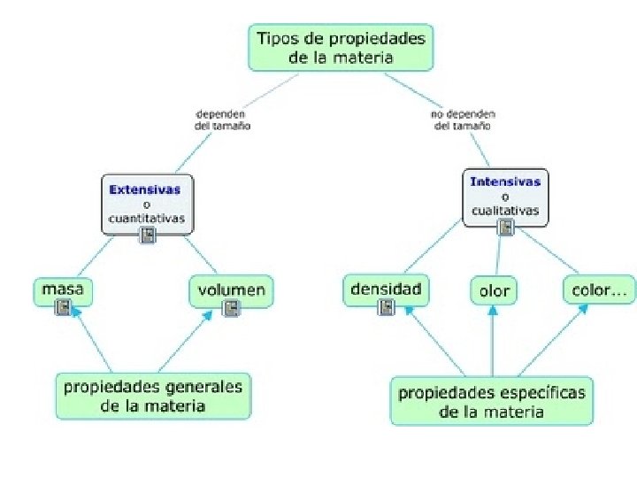 Todas las propiedades medibles de la materia pertenecen a una de 2 categorías: propiedades extensivas y propiedades intensivas: a) Propiedades extensivas: Son aquellas que varían con la cantidad de materia considerada. Por ejemplo, una bolita de vidrio pesa 5 gramos; una bolita más grande del mismo vidrio pesará más de 5 gramos. Luego, el peso al variar con la cantidad de materia considerada (tamaño de las bolitas), es una propiedad extensiva. b) Propiedades intensivas o específicas: Son aquellas que no varían con la cantidad de materia considerada. Por ejemplo, cuando el agua pura hierve, la temperatura de sus vapores, a presión normal, es de 100º C cualquiera sea la cantidad de agua que se haga hervir.