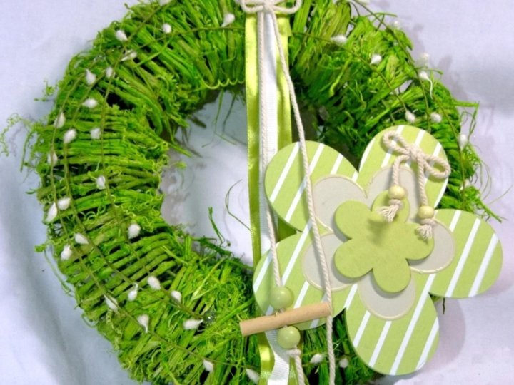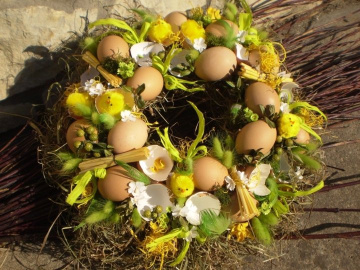 Velikonoční věnce • Oblíbená dekorace dveří, vstupního prostoru či zdi • Podložka vlastní výroby nutná u větších rozměrů, jinak lze koupit z proutí, slámy, sena či ze šlahounů • Někdy může podložka plnit i dekorační funkci • Kompozice stejná jako u jiných věnců, liší se výběrem materiálu