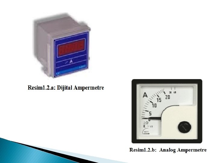 Matematiksel olarak ifade etmek gerekirse � Basit bir ampul ışık yaymak için 0, 4 amper akım çeker. Ya da ampulün akım değeri “I= 0, 4 A” denir. � Yemek pişirmek için mutfaklarda kullanılan fırınlar çalıştırıldıklarında bağlı bulundukları şebekeden 9 amper akım çeker. Fırının akım değeri “I= 9 A”dır. Elektrik akımı, ölçülebilir birimdir. Elektrik akımını ölçen ölçü aletlerine ampermetre denir.