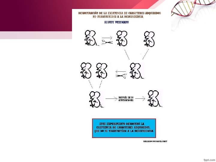 Pangenesis’in yanlış olduğunun kanıtlanması. • Darwinin yarı kuzen bir akrabası olan Francis Galton en önemli keşiflerden birini yapmıştır. • Kanda serbest halde dolaşan gemülleri test etmiştir. • Monrel tavşanlarından kan alıp bu kanı gümüş-gri safkan tavşanlara aktardı. • Kanda serbest halde dolaşan gemüllerin sonraki jenerasyonlarda kalıtım paternini değiştirmesini bekledi. • Tabi değişmedi… gümüş gri tavşanlar üretmeye devam ettiler.