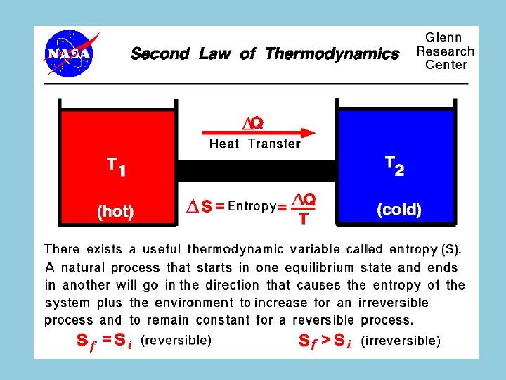 Second Law of Thermodynamics • The second law of thermodynamics states that for any process occurring in a closed system, the entropy increases for an irreversible system and remains constant for a reversible system, but never decreases.