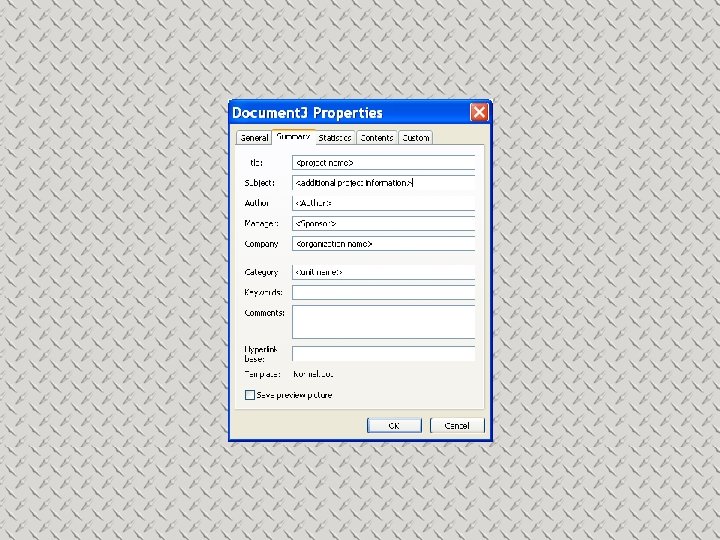 Standard template sections for document administration • About this document – objective, purpose • Related documents – other project docs that help reader understand project • Summary of changes – version, date, author and description of change • Reviews and Approvals – who, role, date • Distribution list – stakeholders to receive completed document