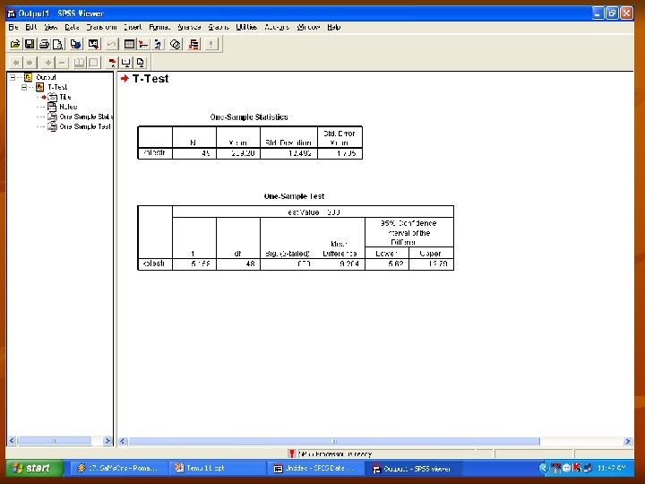 n Statistik yang dapat dihasilkan dari uji ini adalah : n n Mean Standar Deviasi Standar Error of mean Rata-rata perbedaan antara setiap nilai data dan nilai yang dihipotesa.