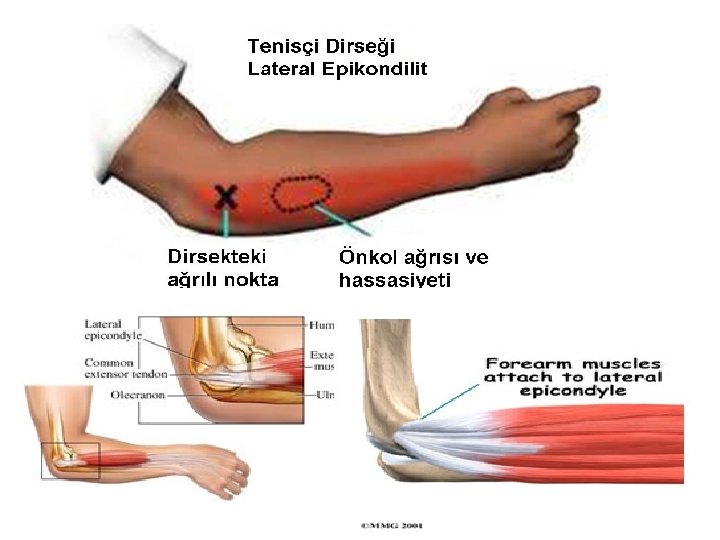 Lateral Epikondilit (Tenisçi Dirseği) • En sık 40 60 yaşlar arasında görülür. • El bileği ekstansör kas grubununun dirsekte periosta tutunduğu lateral epikondilde tendinit ve periostit görülür. Klinikte, yavaş başlangıçlı, önkola, omuza ve el sırtına yayılan ağrı vardır. • Ağrıya neden olan hareketlerden kaçınma ve etkilenen tarafın istirahate alınması tedavinin ilk basamakları • Lateral epikondilit bandı ve el bileği istirahat splinti, ekstansör kas grubunun aktivitesini azaltmak amacıyla