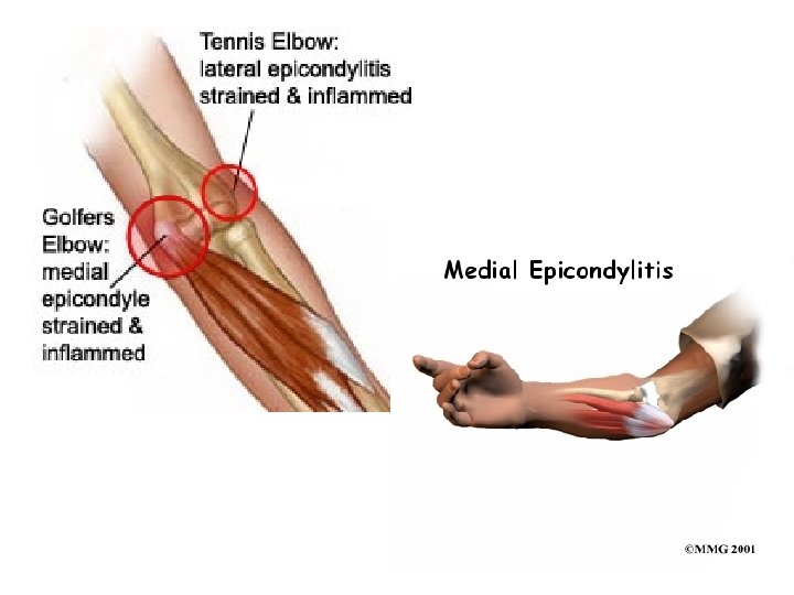 Medial Epikondilit (Golfçü Dirseği) • El bileği fleksör ve pronatör kas tendonlarının medial epikondildeki yapışma yerinde oluşan tendoperiostitdir. • Klinik seyri daha hafiftir. • Dirsek medialinde önkol fleksör yüzüne yayılan ağrı vardır. • Medial epikondil palpasyonu ağrılıdır.