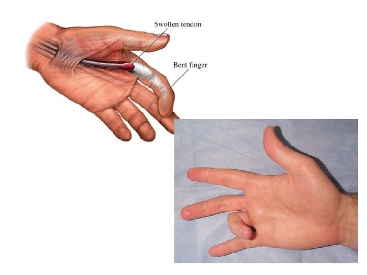 Tetik Parmak (Stenozan Tenovajinit) • Elde en sık rastlanan tekrarlayıcı, travmatik hastalıktır. • Başparmak ve diğer parmaklann fleksör tendonlarında ortaya çıkar. • Anatomik lezyon, başparmak ve diğer parmak lann fleksör tendonlannın metakarpofalangeal eklem üzerinde bulunan lokalizasyonunda fıbrozis ve daralma ile sonuçlanan tenosinovitidir. • Daralmanın olduğu lokalizasyonda tendon nodülü oluşur. • Tendonun hareketi sırasında daralan bölgede takılma ve sonrasında ani atlama ortaya çıkar (tetik parmak). • İleri aşamada ise fleksiyonda kilitlenme gelişir. En sık nedeni tekrarlayan kavrama hareketi sonucu oluşan aşın kullanım travmasıdır.