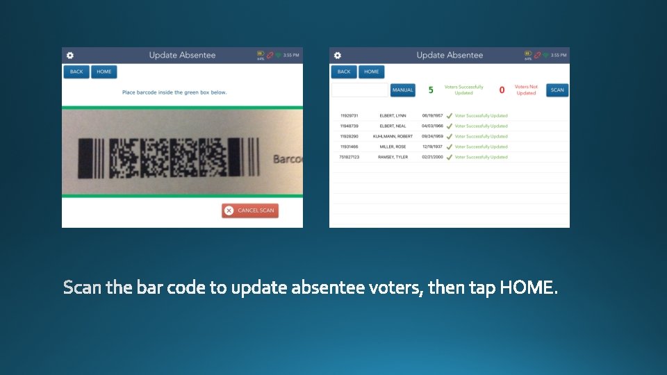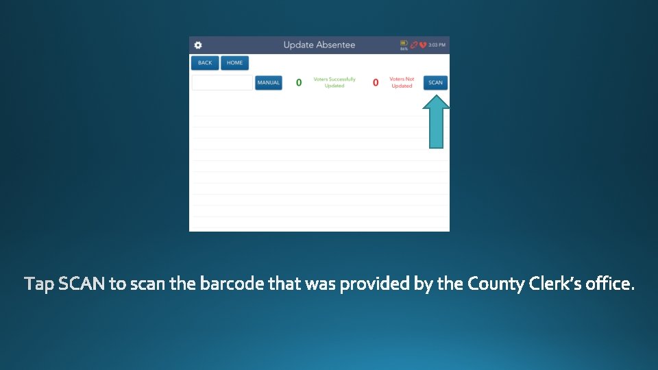 IF you receive a list of updates instead of a bar code from the County Clerk’s Office: -Enter each absentee voter’s ID number, then tap MANUAL. You’ll see the voter’s information and successful update information below. Repeat for each subsequent voter. When you’re finished, tap HOME. NOTE: If you make a mistake, the information that you entered will still be displayed in the list, but it will say “X Update Failed: Voter Not Found”