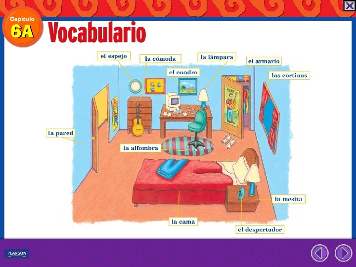 to talk about things in a bedroom la alfombra el armario la cama la cómoda las cortinas el cuadro el despertador el dormitorio el espejo el estante la lámpara la mesita la pared rug closet bed dresser curtains painting alarm clock bedroom mirror shelf, bookshelf lamp night table wall
