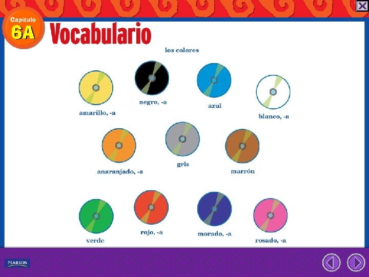 to talk about colors ¿De qué color. . . ? los colores amarillo, -a anaranjado, -a azul blanco, -a gris marrón morado, -a negro, -a rojo, -a rosado, -a verde What color. . . ? colors yellow orange blue white gray brown purple black red pink green