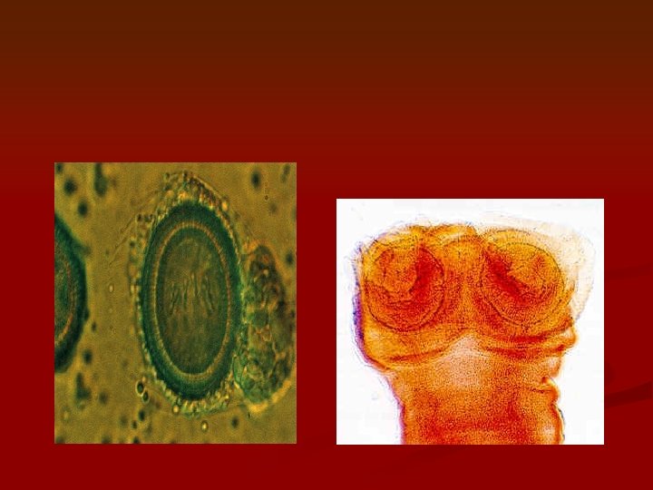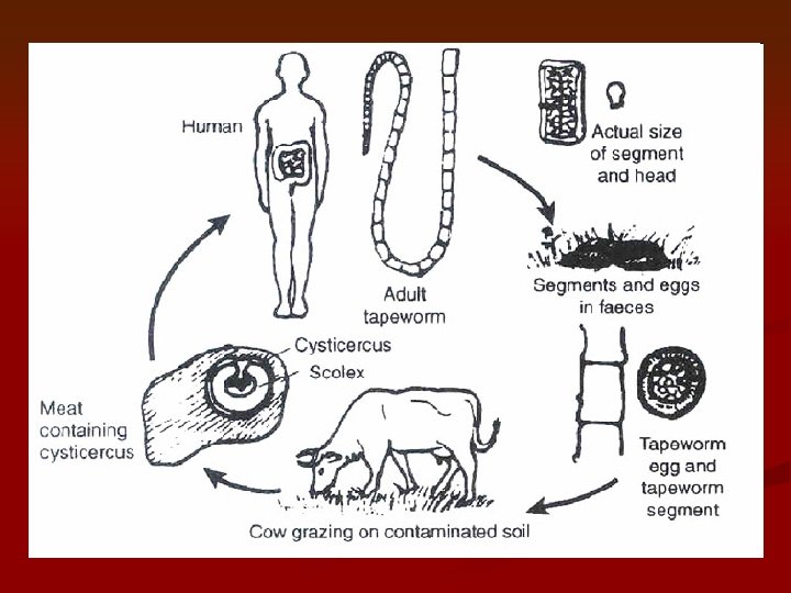 The life cycles of these two cestodes involve alternate larval and adult stages in two hosts: intermediate and definitive. Adult worms attach to the intestine by means of the scolex and absorb nutrients from the host. A ribbonlike chain of segments called proglottids form, each of which contains male and female sexual organs and produce ova. Proglottids or ova are passed in the feces sporadically; multiple examinations may be required for diagnosis. Intermediate hosts (cattle, pigs) ingest the eggs and develop larval cysts in their tissues. Cysts are eaten by the definitive host in uncooked meat; they mature into tape-worms in the digestive tract. Humans may also ingest T. solium eggs, which may travel to brain or muscle to form cysticeri (cysts).