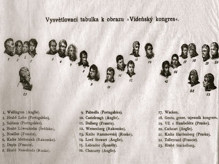 Vídeňský kongres • Jednání o budoucím uspořádání Evropy • Hlavní organizátor rakouský kancléř - kníže Metternich • Účast zástupců významných států (Velká Británie, Rakousko, Rusko, Francie, Prusko) • Rozhodující význam představitelů Anglie, Ruska, Rakouska a Pruska → „výbor čtyř“