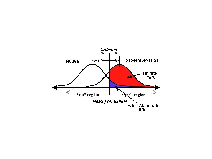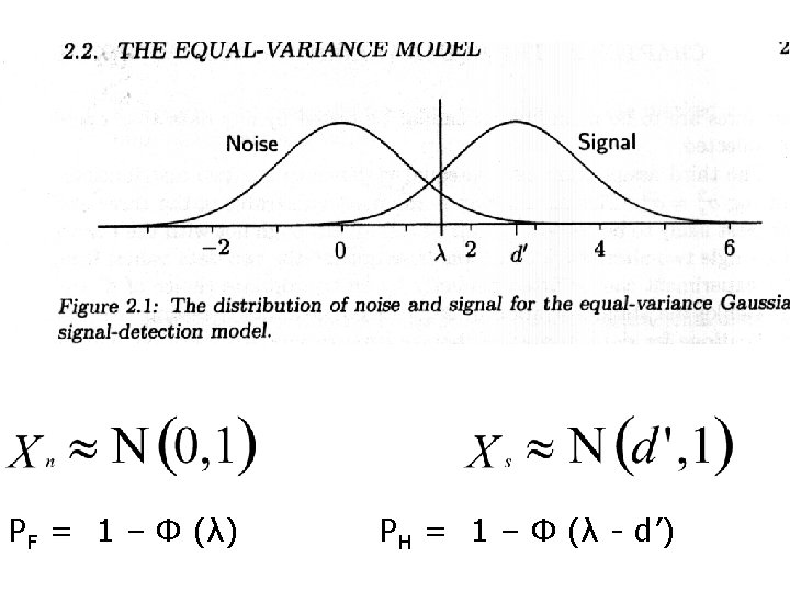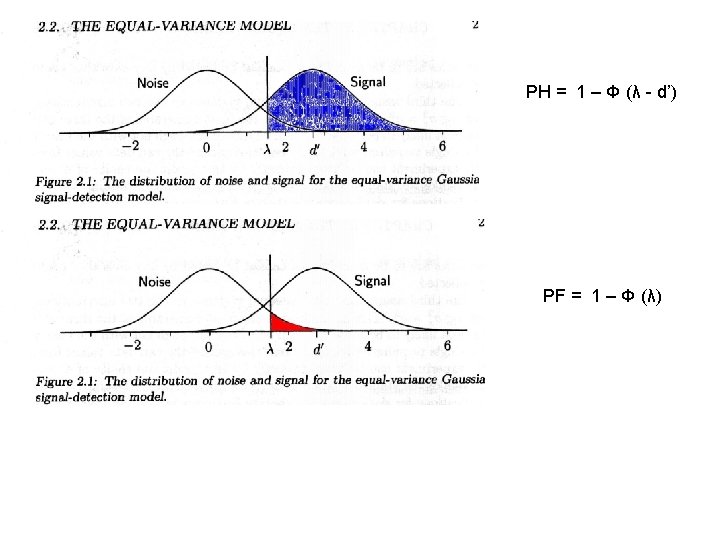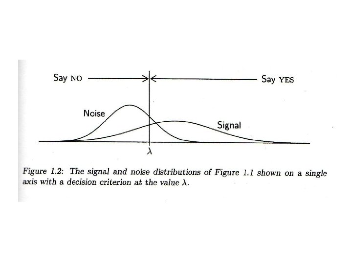 NO SI Σ RUIDO 54 46 100 SEÑAL 18 82 100 FALSE ALARM RATE: f = 46/100 =. 46 λ = Φ (1 -f) = Φ(1 -. 46)= Φ(. 54) = 0. 1 HIT RATE: h=82/100 =. 82 cae arriba de una distribución centrada en d’ λ - d’ : Φ (h) = Φ (. 82) =. 915 λ queda. 915 unidades debajo de d’ λ - d’ =. 092 λ = z (1 -f) = ; λ = -z (f); d’ =z(h) –z(f) =. 915 – (-. 1) = 1. 015 z(1 -h) = λ – d’; z(h) = d’ - λ