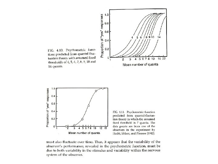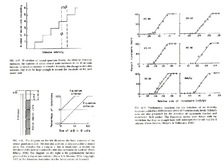Teoría Cuántica Neural • Un intento por derivar una función psicométrica lineal a partir del supuesto de que la discriminación ocurre a lo largo de una dimensión sensorial dentro del observador compuesta de pequeños pasos discretos (cuánticos) • Un observador puede detectar un incremento ΔΦ, en un estímulo Φ, solo cuando es suficientemente grande como para excitar una unidad neuronal adicional. • p = estimulación excedente, Q incremento necesario para excitar una unidad neuronal adicional. • El valor de ΔΦ que es suficiente para excitar un quantum neural adicional es: ΔΦ = Q – p. • La proporción de ocasiones en que ΔΦ excitará un quantum adicional es: r 1 = ΔΦ/Q. • La predicción para un umbral de dos unidades es r 2 = (ΔΦ – Q)/Q