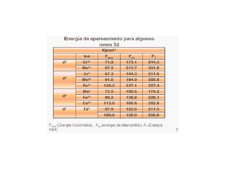 Factores que determinan el valor de 3. - Naturaleza del ión metálico : ubicación en la tabla periódica aumenta a medida que se baja en un grupo [ Co(NH 3) 6]3+ o = 22. 900 cm -1 [ Rh(NH 3) 6]3+ o = 34. 100 cm -1 [ Ir(NH 3) 6]3+ o = 41. 000 cm -1 Los complejos de la 2 y 3 ra serie son siempre de bajo spin
