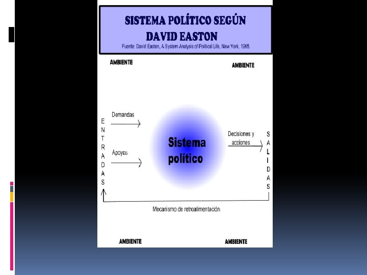 DAVID EASTON: Un sistema político es un conjunto de interacciones políticas. Lo que distingue las interacciones políticas del resto de interacciones sociales es que se orientan hacia la asignación autoritaria de valores a una sociedad.