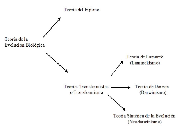 Teorías Transformistas o Evolucionistas • Fue postulada, por Lamarck, conocida también como Lamarckismo y consiste en que los seres vivos van cambiando desde las especies más simples a las más complejas, siendo el hombre la culminación y la especie mejor adaptada. • Señala además que un organismo va transformando sus órganos para adaptarse al medio ambiente. Es decir, aquel órgano que se usa con frecuencia será de gran tamaño y desarrollado, mientras que el que se usa menos será pequeño y menos desarrollado.
