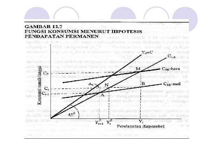 l Menurut hipotesis pendapatan permanen, tingkat konsumsi seseorang pada suatu waktu tertentu bukan ditentukan oleh pendapatan yang sebenarnya diterima pada waktu tersebut tetapi oleh pendapatan permanen pada waktu tersebut.