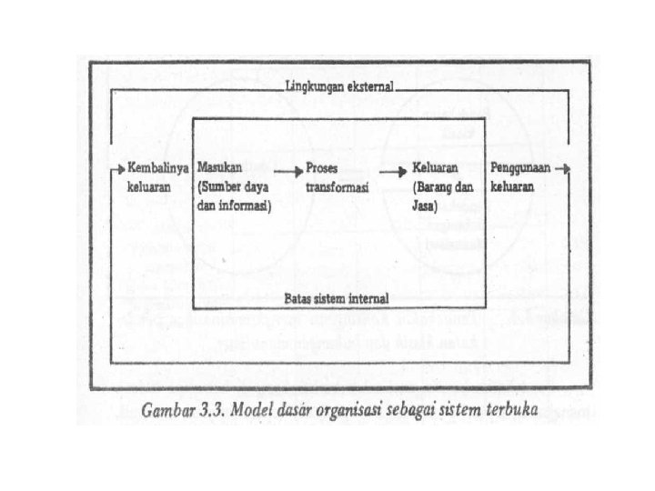 Teori manajemen modem cenderung memandang organisasi sebagai sistem terbuka, dengan dasar analisa konsepsional, dan didasarkan pada data empirik, serta sifatnya sintesis dan integratif. Sistem terbuka pada. hakekatnya merupakan proses transtormasi masukan yang menghasilkan keluaran; transformasi terdiri dari aliran informasi dan sumber daya yang dapat di gambar kan seperti terat pada gambar 3. 3. Keluaran dari organisasi merupakan masukan bagi lingkungannya, dan sebaliknya keluaran dari lingkungan adalah masukan bagi suatu organisasi.