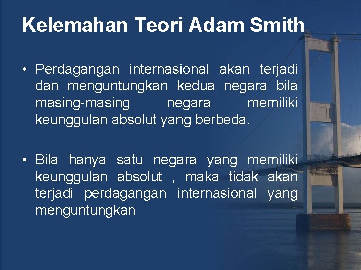 Kelemahan Teori Adam Smith • Perdagangan internasional akan terjadi dan menguntungkan kedua negara bila masing-masing negara memiliki keunggulan absolut yang berbeda. • Bila hanya satu negara yang memiliki keunggulan absolut , maka tidak akan terjadi perdagangan internasional yang menguntungkan