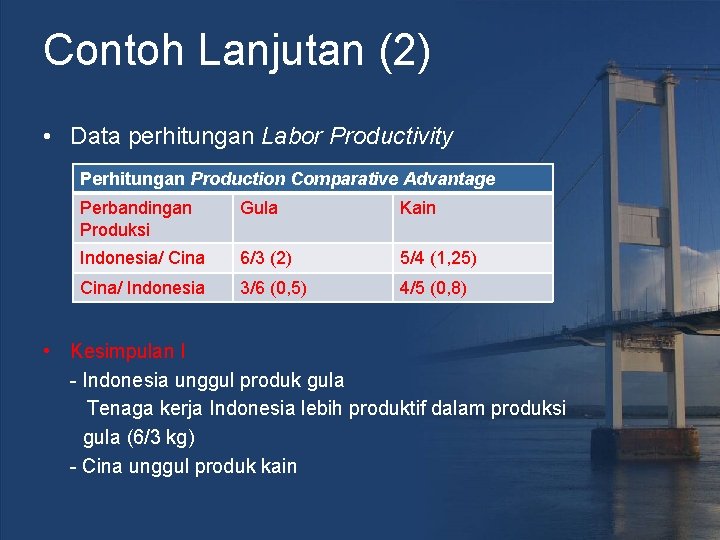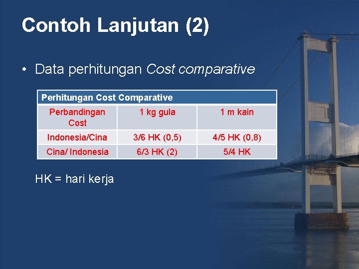 Contoh Lanjutan (2) • Data perhitungan Cost comparative Perhitungan Cost Comparative Perbandingan Cost 1 kg gula 1 m kain Indonesia/Cina 3/6 HK (0, 5) 4/5 HK (0, 8) Cina/ Indonesia 6/3 HK (2) 5/4 HK HK = hari kerja