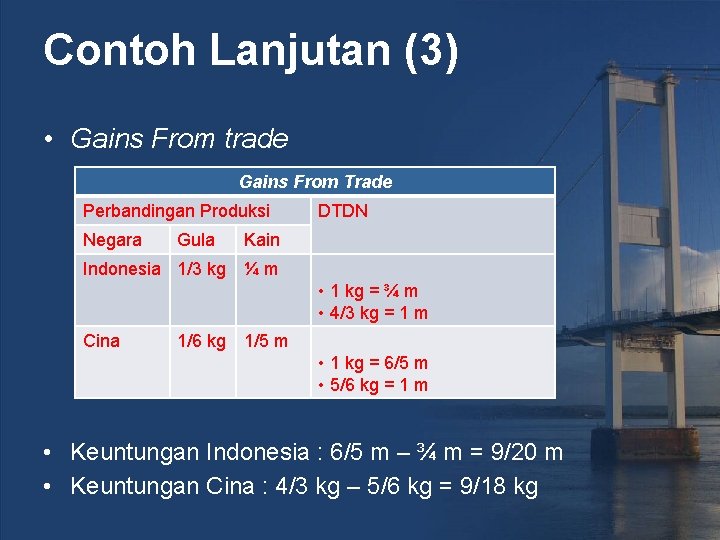 Contoh Lanjutan (3) • Kesimpulan 2: - Indonesia memperoleh keuntungan 6/5 m -3/4 m = 9/20 m sutra - Cina memperoleh keuntungan 4/3 kg – 5/6 kg = 3/6 kg