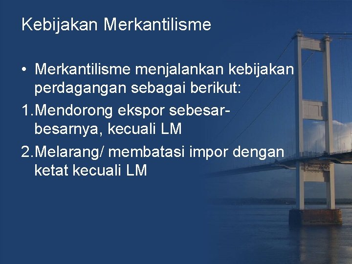 Kebijakan Merkantilisme • Merkantilisme menjalankan kebijakan perdagangan sebagai berikut: 1. Mendorong ekspor sebesarnya, kecuali LM 2. Melarang/ membatasi impor dengan ketat kecuali LM
