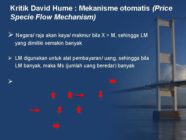 Kritik David Hume : Mekanisme otomatis (Price Specie Flow Mechanism) Ø Negara/ raja akan kaya/ makmur bila X > M, sehingga LM yang dimiliki semakin banyak Ø LM digunakan untuk alat pembayaran/ uang, sehingga bila LM banyak, maka Ms (jumlah uang beredar) banyak Ø