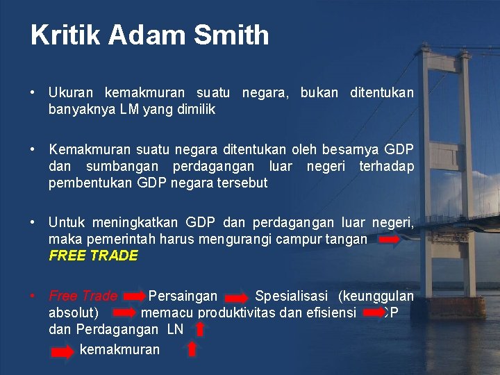 Kritik Adam Smith • Ukuran kemakmuran suatu negara, bukan ditentukan banyaknya LM yang dimilik • Kemakmuran suatu negara ditentukan oleh besarnya GDP dan sumbangan perdagangan luar negeri terhadap pembentukan GDP negara tersebut • Untuk meningkatkan GDP dan perdagangan luar negeri, maka pemerintah harus mengurangi campur tangan FREE TRADE • Free Trade Persaingan Spesialisasi (keunggulan absolut) memacu produktivitas dan efisiensi GDP dan Perdagangan LN kemakmuran