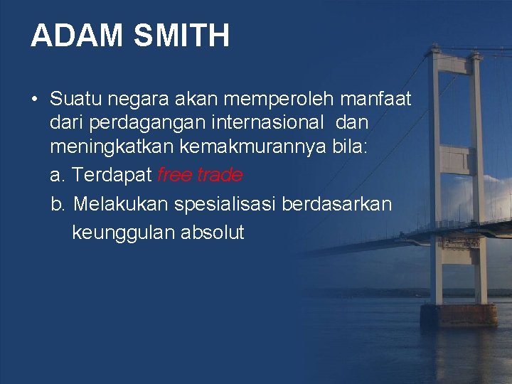 ADAM SMITH • Suatu negara akan memperoleh manfaat dari perdagangan internasional dan meningkatkan kemakmurannya bila: a. Terdapat free trade b. Melakukan spesialisasi berdasarkan keunggulan absolut