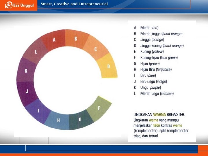 KLASIFIKASI WARNA • Teori Brewster pertama kali ditemukan pada tahun 1831. • Teori ini menyederhanakan warna-warna yang ada di alam menjadi empat klasifikasi yaitu: warna primer, sekunder, tersier dan warna netral. • Warna yang diklasifikasi adalah warna yang berasal dari pigmen. • Untuk lebih memudahkan pemahaman, Brewster membuat suatu pola warna yang berbentuk lingkaran. Selanjutnya lingkaran warna ini dikenal dengan lingkaran warna Brewster.