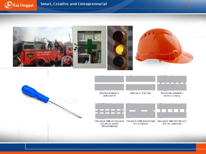 PENGGUNAAN WARNA • Pada kehidupan sehari-hari, warna memiliki berbagai kegunaan diantaranya sebagai berikut: 1) Praktis, yaitu sebagai tanda pemberitahuan Ø Merah: tanda tempat peralatan pemadam kebakaran, tanda bahaya Ø Hijau: untuk kotak PPPK, sesuatu yang aman Ø Kuning/hitam: tanda harus berhati-hati Ø Jingga: bagian mesin yang bergerak dan yang dapat mendatangkan kecelakaan Ø Biru: handel, kotak skakel listrik. Ø Putih: garis lalu-lintas (marka)