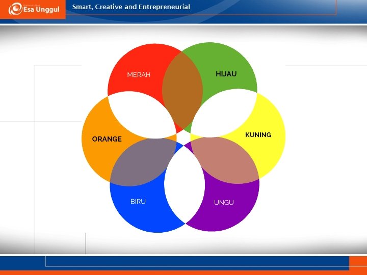 WARNA TERTIER • Warna tersier merupakan campuran salah satu warna primer dengan salah satu warna sekunder. • Sebagai contoh, warna jingga kekuningan didapat dari percampuran warna kuning dan jingga. • Warna indigo (biru keunguan) diperoleh dari percampuran warna biru dan ungu. • Warna turquoise merupakan campuran warna biru dengan hijau dan seterusnya