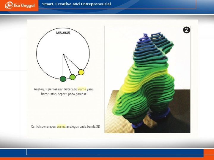 WARNA ANALOG • Skema warna analog terdiri dari warna-warna yang saling berdekatan dalam lingkaran warna. • Kombinasi dari warna-warna analog memberikan harmoni dan kedamaian dikarenakan komposisi warna ini selaras dan tidak membosankan.
