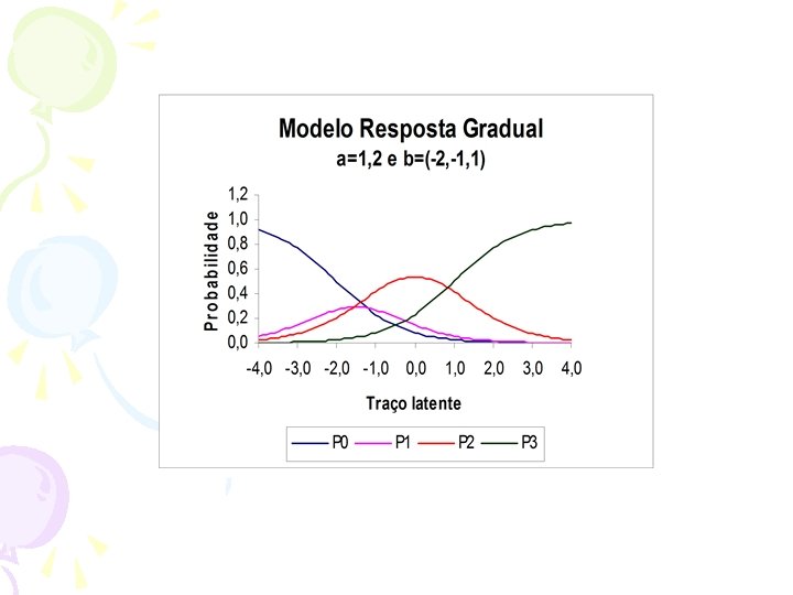 Modelos • Depende do tipo de item • Item de múltipla escolha (corrigido como certo/errado) Logístico (unidimensional) com 1, 2 ou 3 parâmetros ( p/ itens corrigidos como certo/errado)