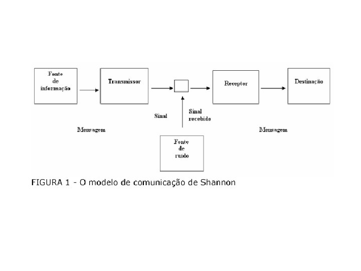 • Três níveis de problemas: técnicos (exatidão do transporte), semânticos (sentido, significado), pragmáticos (efeitos no comportamento do receptor) • Descrição do processo: Fonte, Transmissor, Sinal, Canal, Receptor, Destino (linearidade, fragmentação e papéis fixos) • Definição de informação: a medida da incerteza, grau de novidade, de liberdade de escolha (não o que se diz mas o que se poderia dizer) • Conceitos correlatos: repertório, estrutura, código, entropia, redundância, ruído • Objetivo da teoria: quantificar a informação