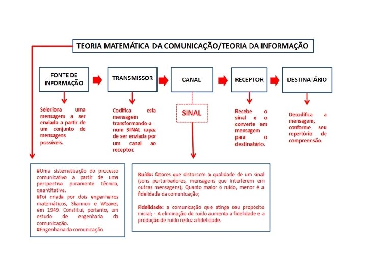 Teoria Matemática • Formulada em 1948 por dois engenheiros em telecomunicações • Três níveis de problemas: técnicos, semânticos e de eficácia • Definição de informação: medida da incerteza • Conceitos: repertório, estrutura, código, redundância • Objetivo de quantificar, medir (ex: SRI, Google) • Taxa de novidade