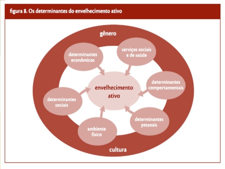 p O termo “saúde” refere-se ao bem-estar físico, mental e social, como definido pela Organização Mundial da Saúde (OMS). Por isso, em um projeto de envelhecimento ativo, as políticas e programas que promovem saúde mental e relações sociais são tão importantes quanto aquelas que melhoram as condições físicas de saúde.