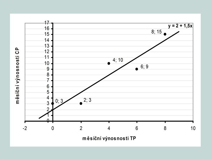 Empirické testování modelu rovnováhy • příklad výnosnosti cenného papíru a tržního portfolia (indexu) Měsíc Výnosnost CP v % Výnosnost TP v % 1. 10 4 10 = 2 + 4. 1, 5 + 2 2. 3 2 3 = 2 + 2. 1, 5 - 2 3. 15 8 15 = 2 + 8. 1, 5 + 1 4. 9 6 9 = 2 + 6. 1, 5 - 2 5. 3 0 3 = 2 + 0. 1, 5 + 1 Součet 40 20 40 = 10 + 30 + 0