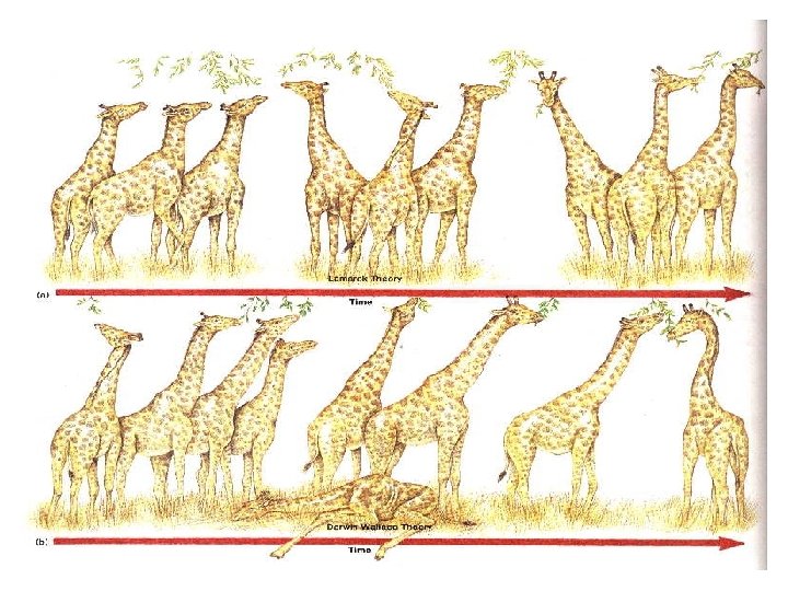 • • Glavne postavke Lamarckove teorije evolucije Lamarck je smatrao da je Zemlja vrlo stara „Oh kako je velika starost kugle zemaljske i kako su sitne misli onih koji za tu kuglu tvrde do od svog početka do danas ima tek šest tisuća i nešto više godina. “ Organizmi neprestano teže usavršavanju Prilagođavanje organizama promjenama u okolišu zbiva se tako da oni jedne organe upotrebljavaju, čime se oni razvijaju, a druge ne upotrebljavaju (oni kržljaju) Tako za života stečene osobine organizma se nasljeđuju tj. prelaze na potomstvo (NETOČNO!!)