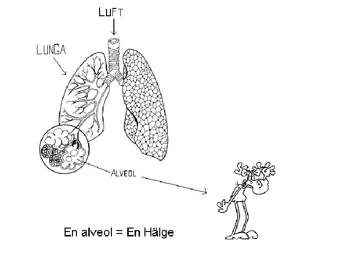 Väl i lungan så går luften fram via små kanaler till alveolerna. Alveolerna tar upp syret ur luften, och skickar vidare det till blodet.