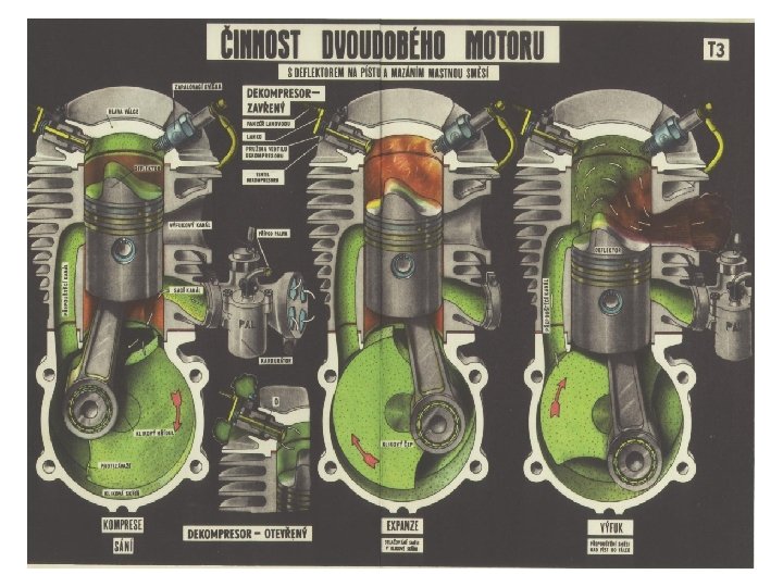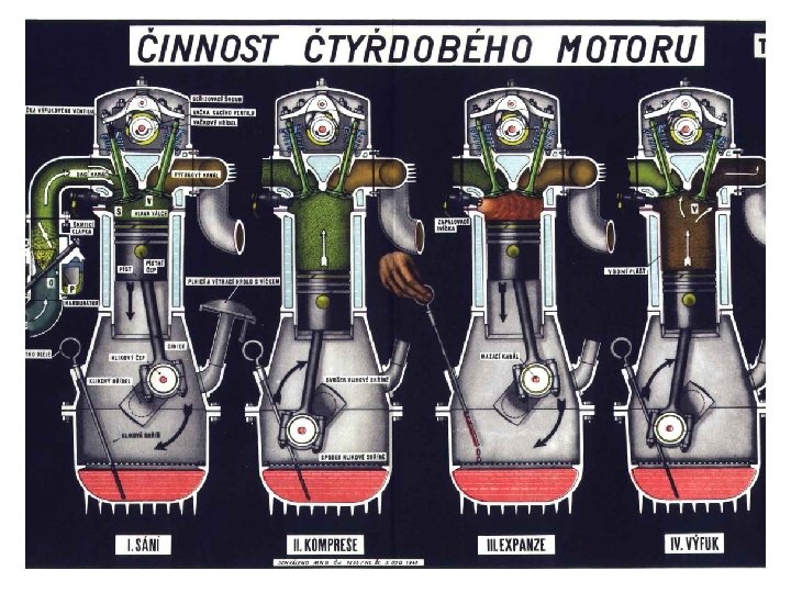 Činnosť štvordobého motora • 1. Nasávanie Pri pohybe piesta smerom nadol sa pomocou vačku otvorí nasávací ventil vo valci sa vytvára podtlak a preto tam prúdi vzduch, ktorý strháva z trysky karburátora benzín. • 2. Stláčanie (kompresia) Oba ventily sú uzavreté, účinkom vonkajšej sily je vo valci stlačená zmes vzduchu a benzínu, ktorá ma tlak asi 1 MPa a teplotu asi 500°C. • 3. Explózia (rozpínanie) Elektrická iskra sviečky zapáli zmes. Plyn, ktorý vznikol spálením paliva má tlak do 3 MPA a teplotu až 2 000°C. Časť vnútornej energie plynu sa premení na pohybovú energiu piesta - koná sa práca. • 4. Výfuk Nasávací ventil je uzavretý, výfukový ventil je otvorený. Piest sa pohybuje nahor a vytláča spálené plyny von.