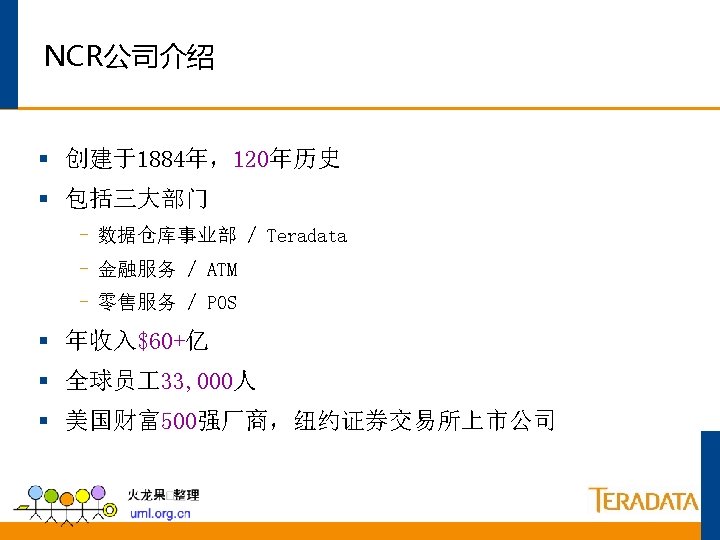 业界的领导企业 (Gartner Magic Quadrant for Data Warehouse Database Management Systems) challengers leaders Teradata ability to execute Oracle IBM Microsoft Sybase Netezza Greenplum My. SQL DATAllegro Kognitio Sand Technology niche players visionaries completeness of vision As of September 2007