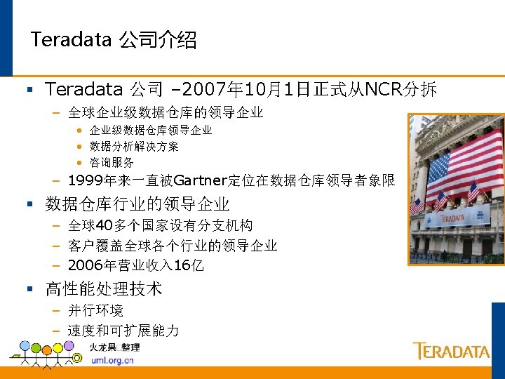 Teradata – A Brief History 1979 – – Teradata Corp founded in Los Angeles, California Development begins on a massively parallel computer 1982 – YNET technology is patented 1984 – – Teradata markets the first database computer DBC/1012 First system purchased by Wells Fargo Bank of California 1987 – First public offering of stock 1989 – Teradata and NCR partner on next generation of DBC. 1991 – NCR Corporation is acquired by AT&T; Teradata revenues at $280 million. 1992 – Teradata is merged into NCR. 1996 – AT&T spins off NCR Corp. with Teradata; Teradata Version 2 is released. 1997 – The Teradata Database becomes the industry leader in data warehousing. 2000 – The first 100+ Terabyte system is put into production. 2002 – Teradata V 2 R 5 released 12/2002; major release including features such as PPI, roles and profiles, multi-value compression, and more. 2006 – Teradata V 2 R 6. 2 is released; BYNET V 3 is available with NCR 5450/5500 systems. 2007 – NCR and Teradata become two separate corporations. Teradata 12. 0 is released in 4 th quarter. 2008 – Teradata's first full year as new corporation; 2500/5550 systems are introduced.